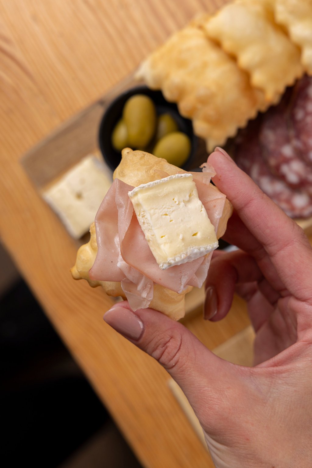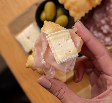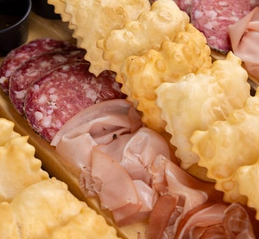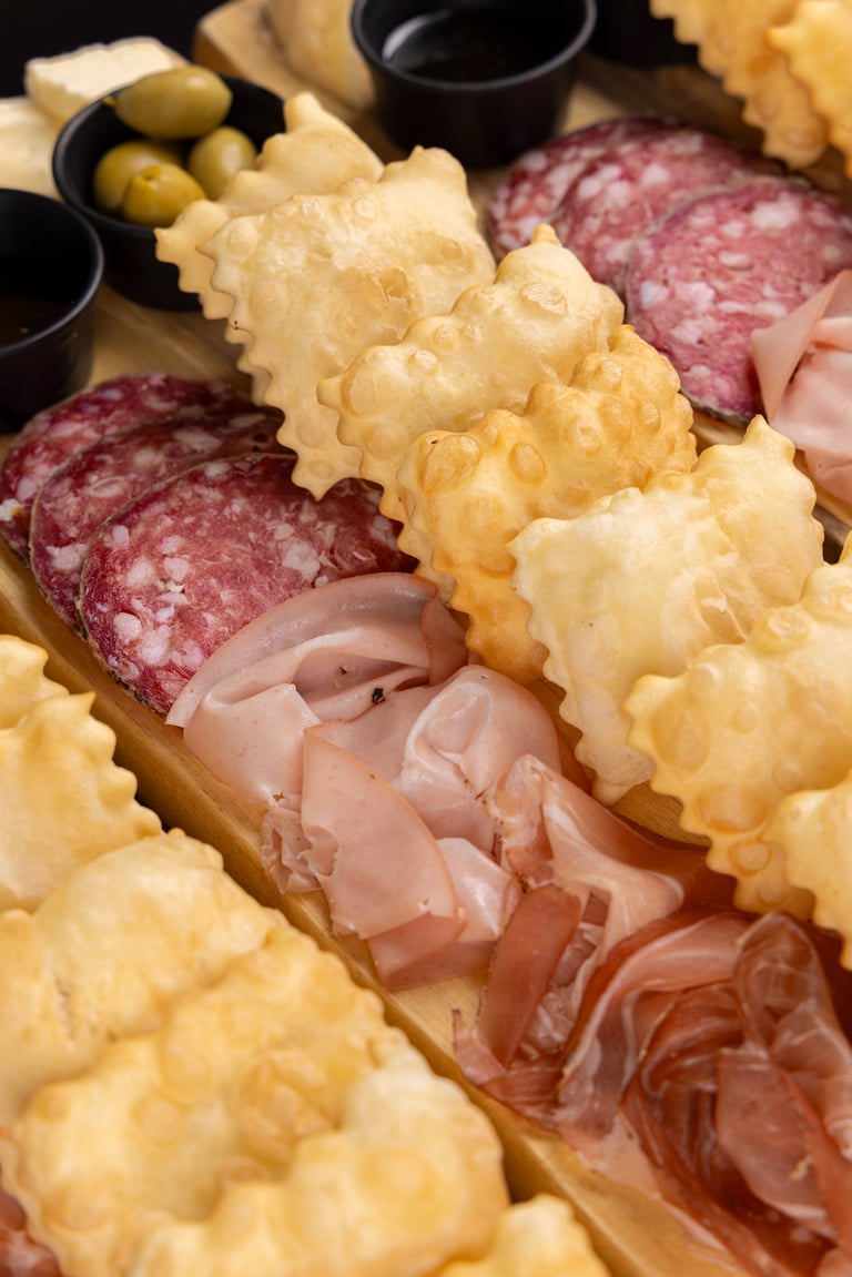 tagliere di gnocco fritto di Modena, servito con salumi nostrani, formaggi, miele e olive di cerignola.