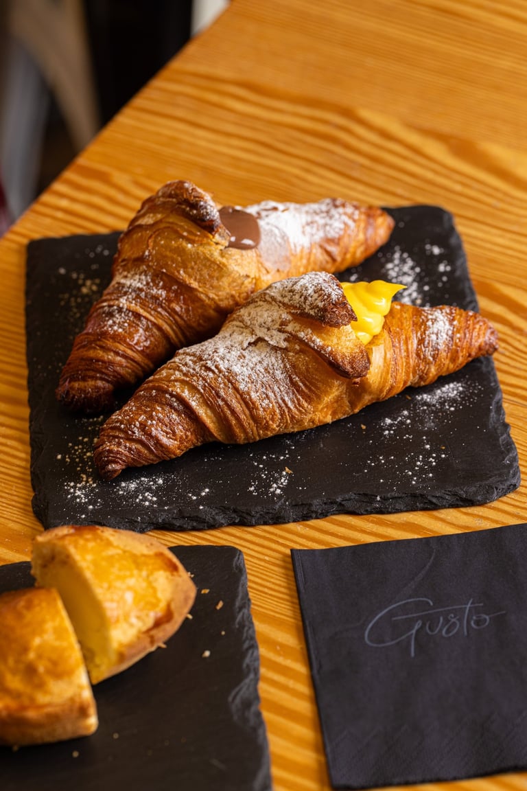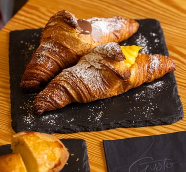ogni giorno ti aspettano i nostri croissant caldi, disponibili in diversi gusti e tipologie, farciti al momento.. anche per vegani! vieni a scoprire la colazione di Gusto :)